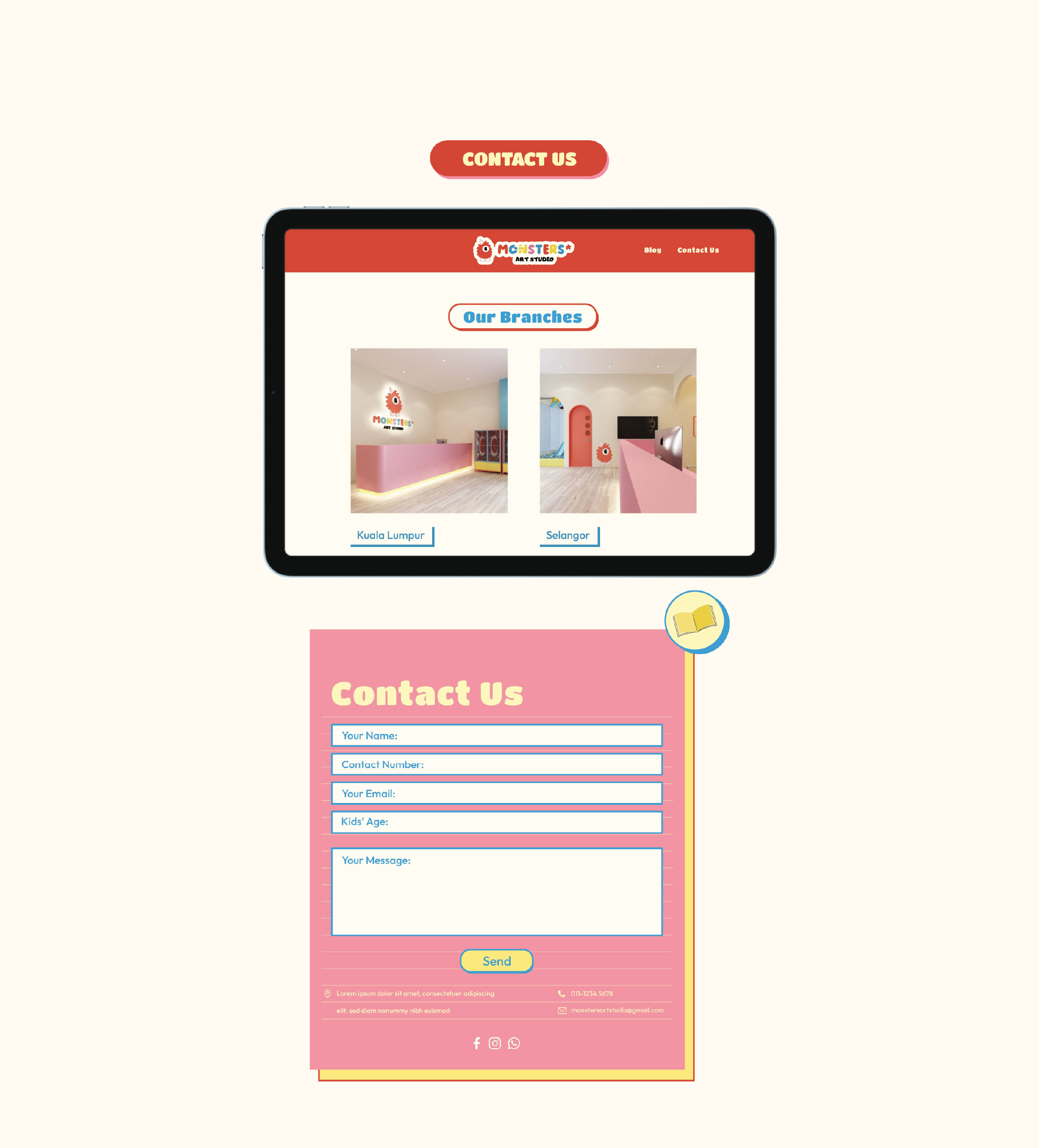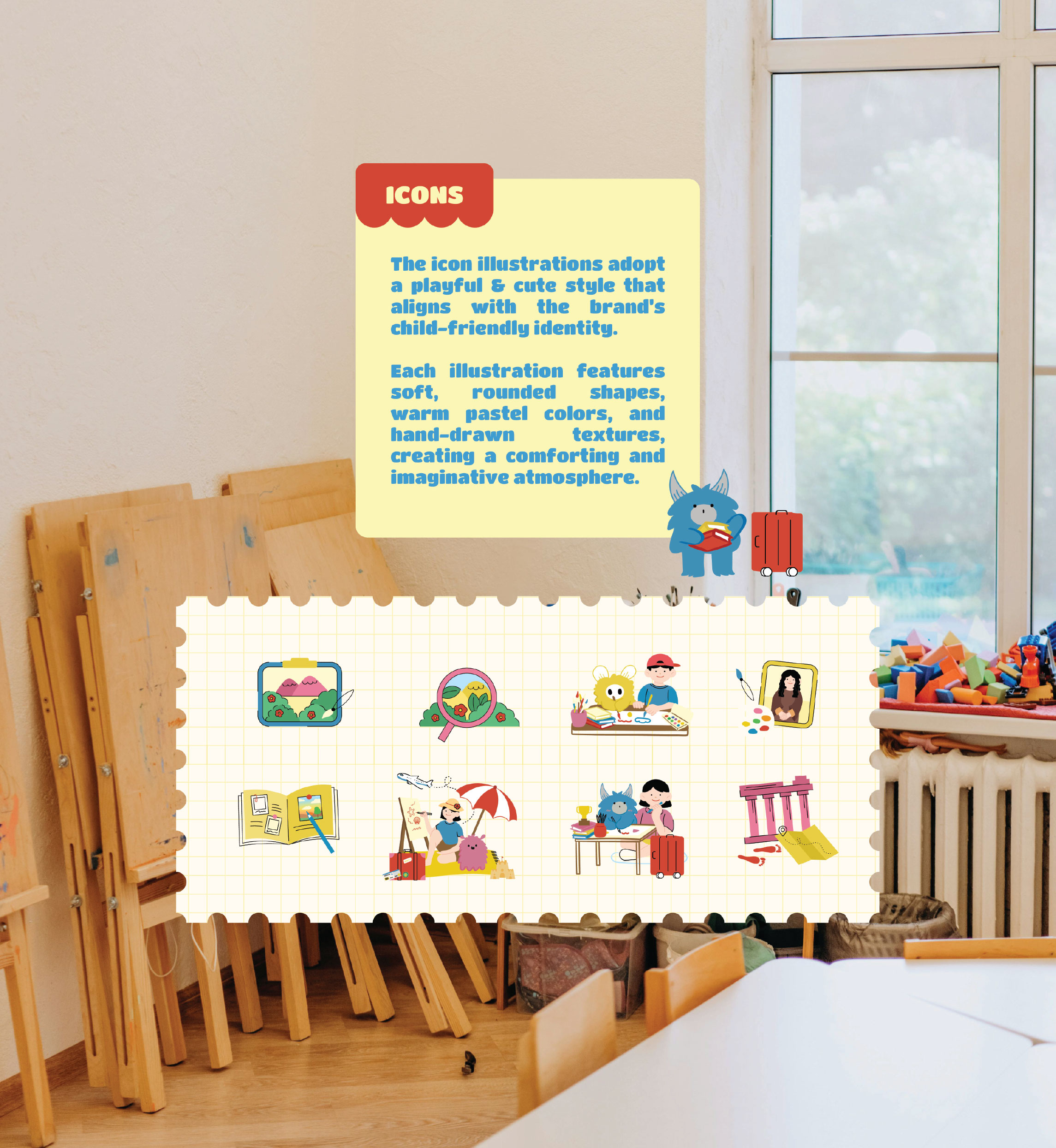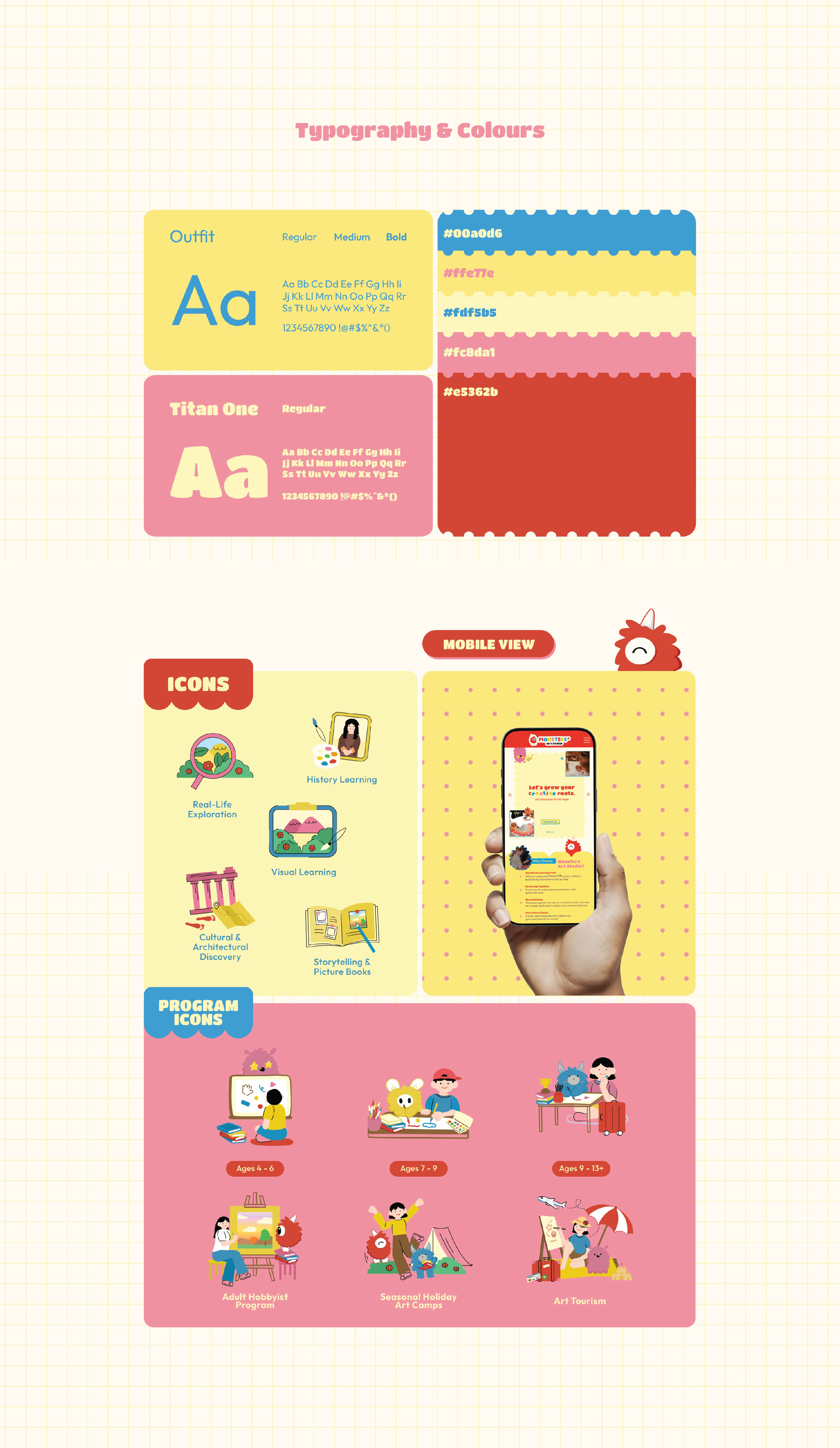 Each page balances playfulness with purpose: hand-drawn elements, soft grids, and monster mascots that make learning art feel like an adventure.