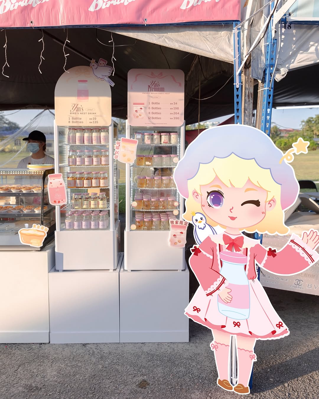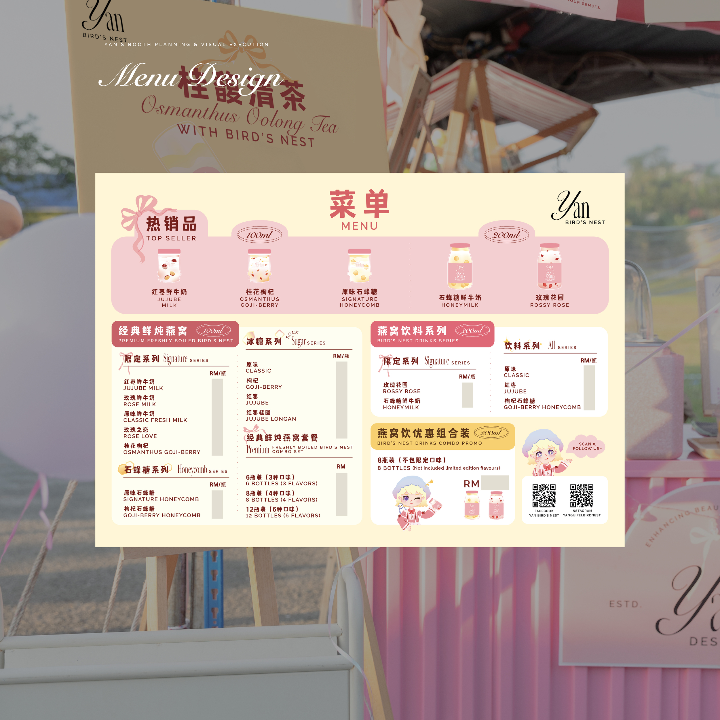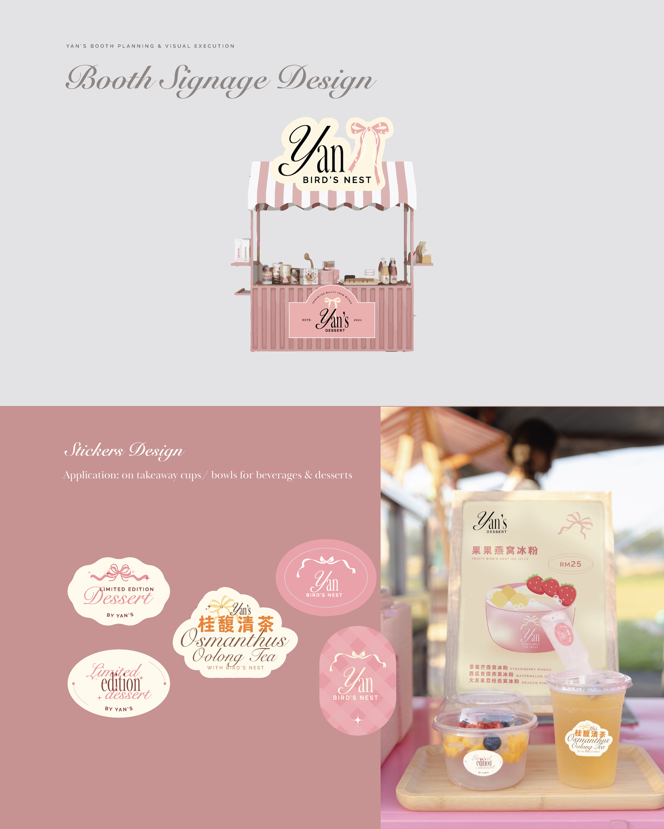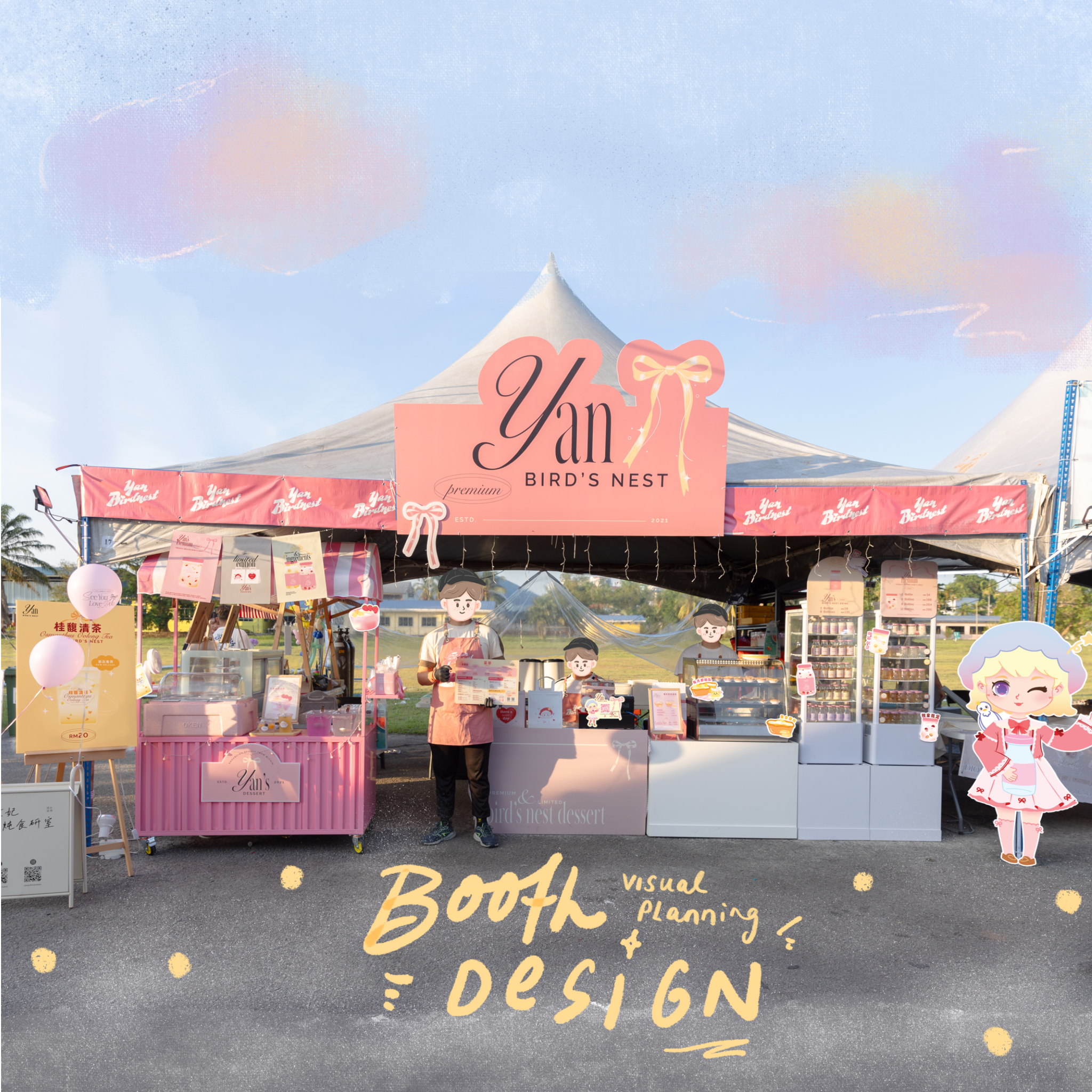Bringing their bird’s nest dessert to life through carefully crafted visuals. From the playful pastel color palette to the sleek signboard and eye-catching buntings, each element was designed to attract and invite. 🎀🍓✨